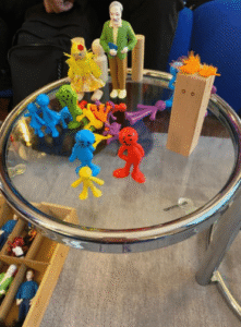 Dans cette représentation, chaque figurine montre comment la personne perçoit sa place au sein du système : certains proches du centre, d’autres à distance, un personnage couché, un autre tourné à l’écart.