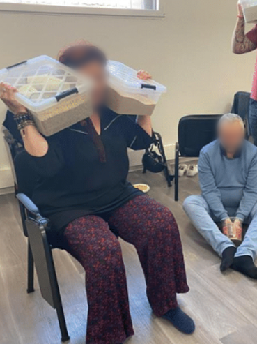 Dans cette scène, chaque participant incarne une part de l’histoire : les boîtes posées sur les épaules ou tenues contre soi représentent ces charges familiales, émotionnelles ou relationnelles que nous portons parfois sans le savoir.