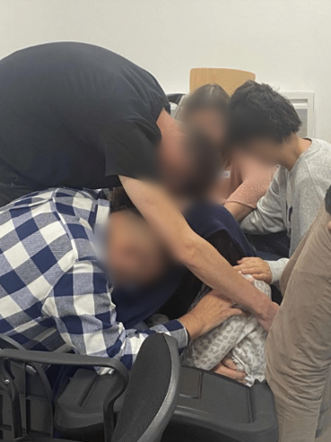Dans cette scène, les participants entourent une personne avec une attention douce et une présence profonde.